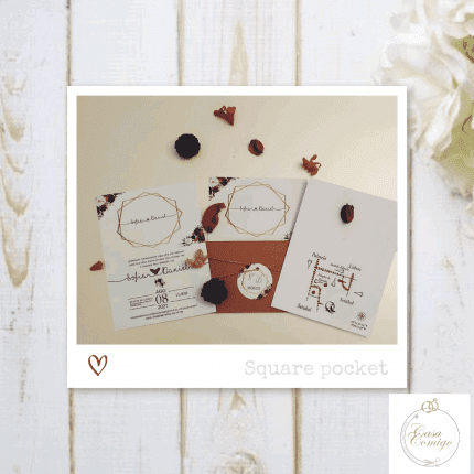 Este convite é feito com papel de alta qualidade, com uma textura suave e um tom levemente envelhecido, que remete ao charme do estilo rústico. A cor predominante é um tom neutro, como o marrom ou o bege, que combina perfeitamente com a proposta do convite.