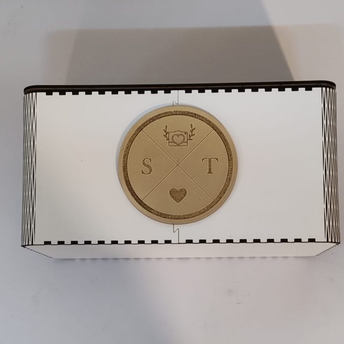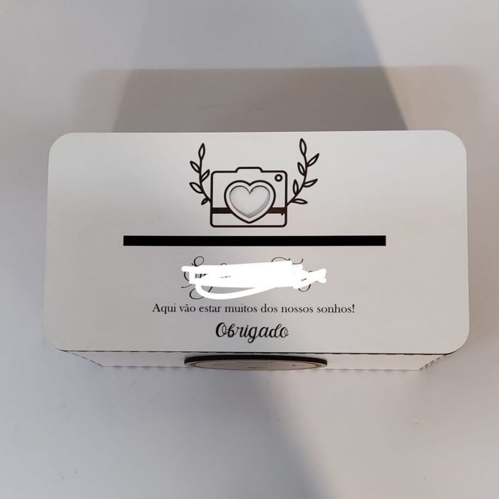 Caixa para envelopes num formato clean rematada com uma tag que pode ser com o monograma, iniciais ou algo do gosto dos noivos